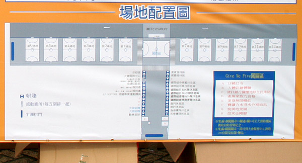 会場見取り図(中央に国際組の少し広いコート、両サイドに12面のコートを設営)