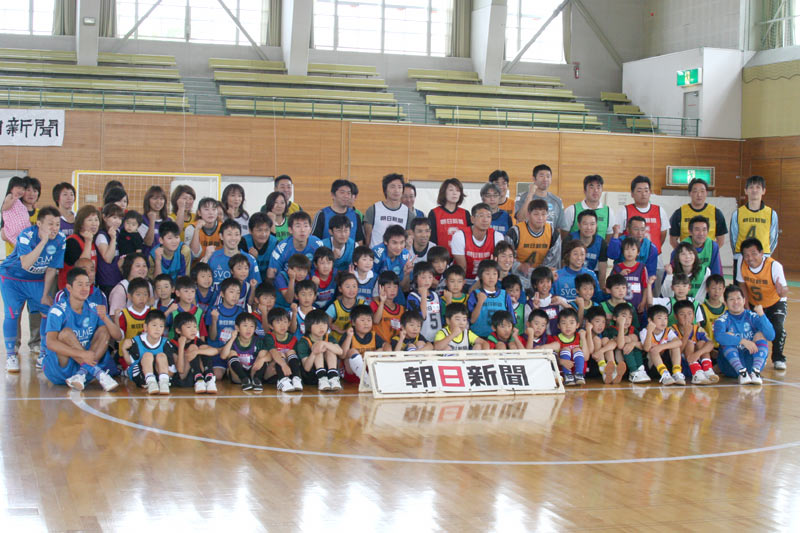 また、午前中は「朝日新聞ファミリーフットサルスクール」がおこなわれ、約40組の親子が参加し、選手と交流を深めながら楽しく受講していました。